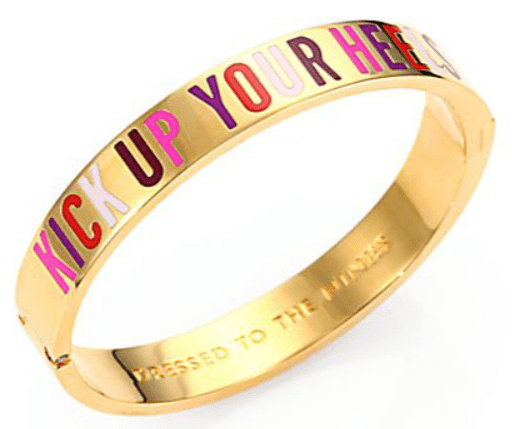 My most recent shopping excursion was to find a retirement gift for my mother. I decided on an Idiom Bangle from Kate Spade with the message “Kick Up your Heels” (fitting, right?). The bangles in this collection are very classy and our favorites are made of shiny 12-karat rose gold plated metal and enamel. As I write this post (and ponder purchasing Smoke and Mirrors…), I notice they are on sale. So go ahead and get one as a Christmas gift for your favorite gal and maybe one yourself, too! 😉
