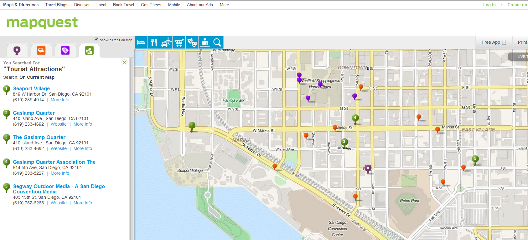 In a few days I’ll be off to sunny San Diego. Before I select one of the many Marriott options, I like to see what’s nearby and calculate the #WalkScore for my temporary home. (I rarely drive at home so driving while on vacation is definitely not in the cards.) After becoming frustrated with Google’s new layout, I randomly decided to check out Mapquest to see what their interface was like and I was pleasently surprised! (it’s been a while since I’ve type that URL….)
