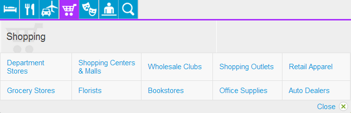 After entering the address to the hotel, the legend was very easy to navigate and I was able to quickly find what I was looking for: restaurants, shopping, travel services, local activities and more! Each category offers drill downs so you can make your search more specific. Though the simplicity is what hooked me, what’s even better is that you can overlay multiple categories on the same map and EASILY see where things are because the categories you selected are color coded. This is exactly what I was looking for!