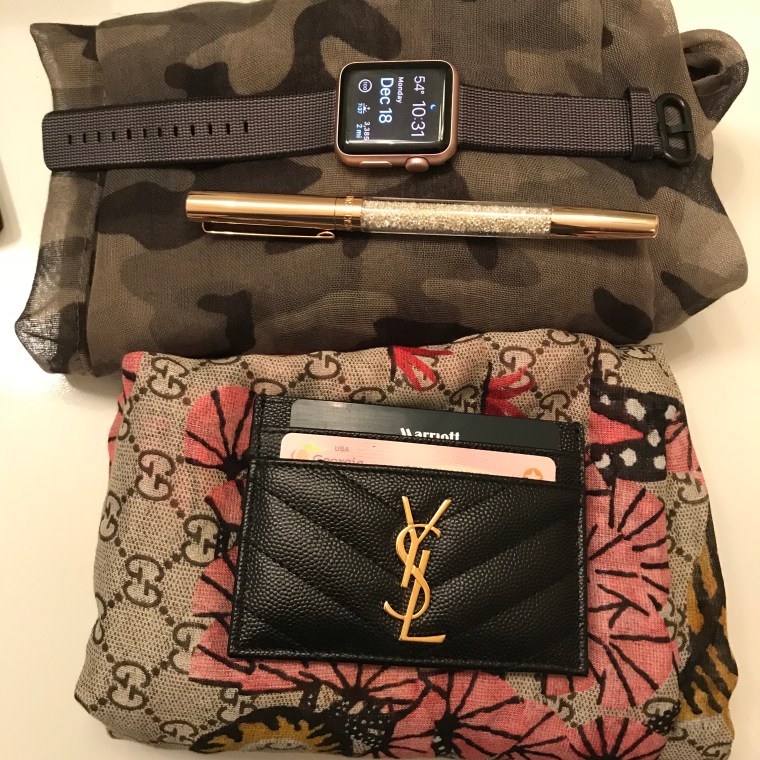 Accessories: I found a couple of wonderful scarves (Gucci, Banana Republic), a black card holder (Saint Laurent), a black Apple watch band (Casetify) and a gold sparkly pen (Swarovoski).