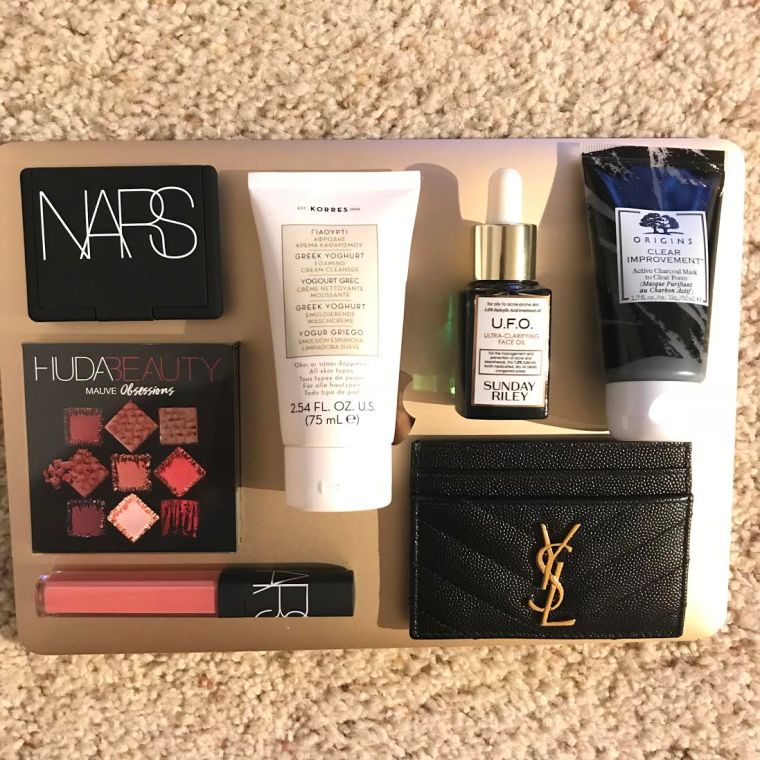 NARS blush (Orgasm), Huda Beauty Obsessions Eyeshadow Palette (Mauve), NARS lip gloss (Chelsea Girls), Korres Greek Yoghurt Foaming Cream Cleanser, Sunday Riley Ultra Clarifying Face Oil, Saint Laurent Textured Matelasst Card Case (Black), Origins Clear Improvement Charcoal Mask to Clear Pores